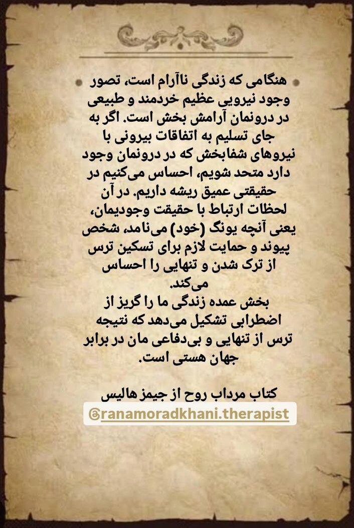 یک میانسال برای رسیدن به آرامش بسیار تلاش کرده و به پرهیز از بحث و اعتراض تن داده و کوتاه آمدن را تکرار کرده است و حالا بیرون و روابط کمی آرام است اما درون و تن و روان در اعتراض!